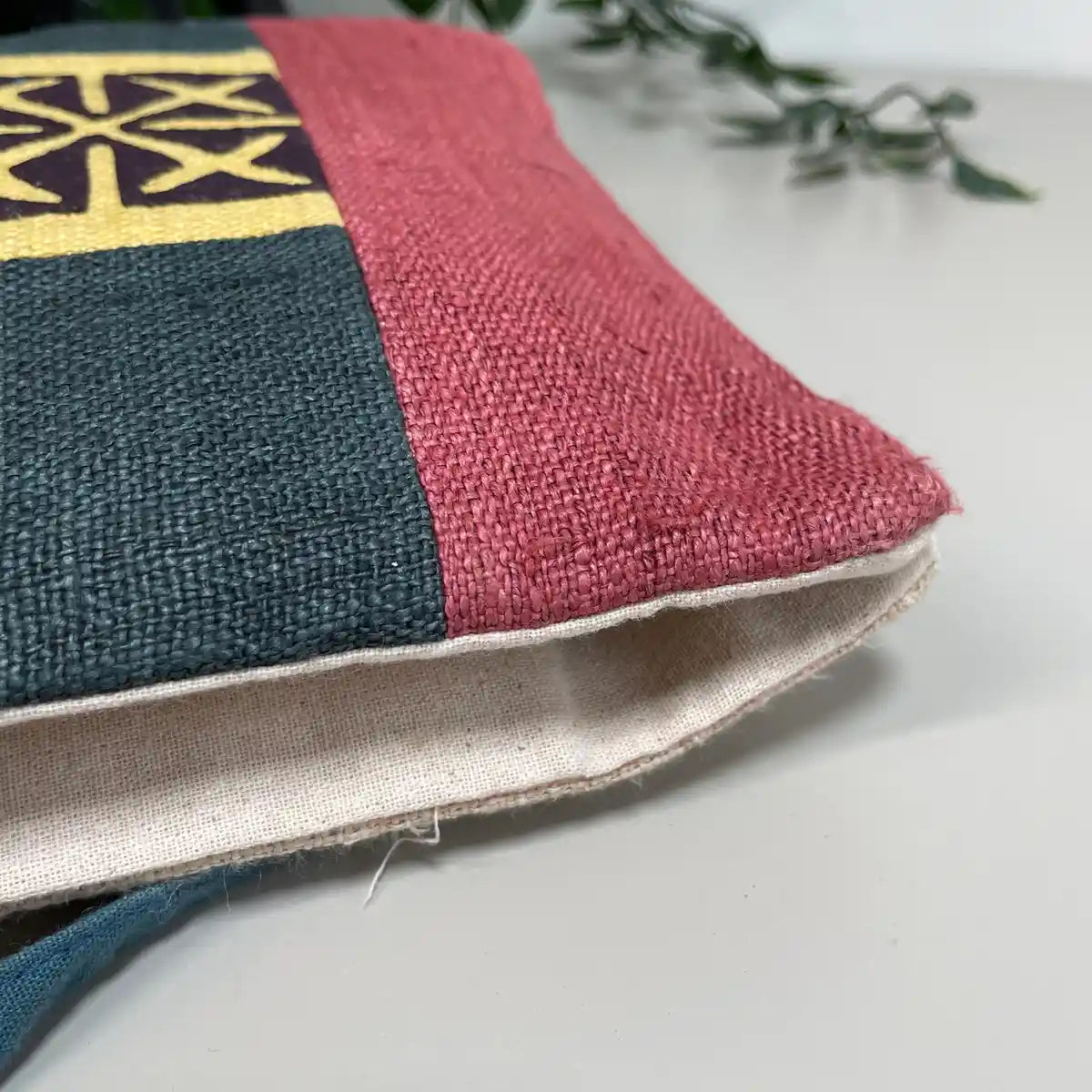The front is a unique patchwork hemp fabric in various colors, with one zipped pocket, one pocket with two coconut buttons to close