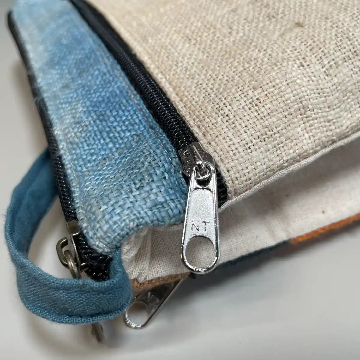 On the back side, there is one zipped pocket, trimmed with hemp in a matching color