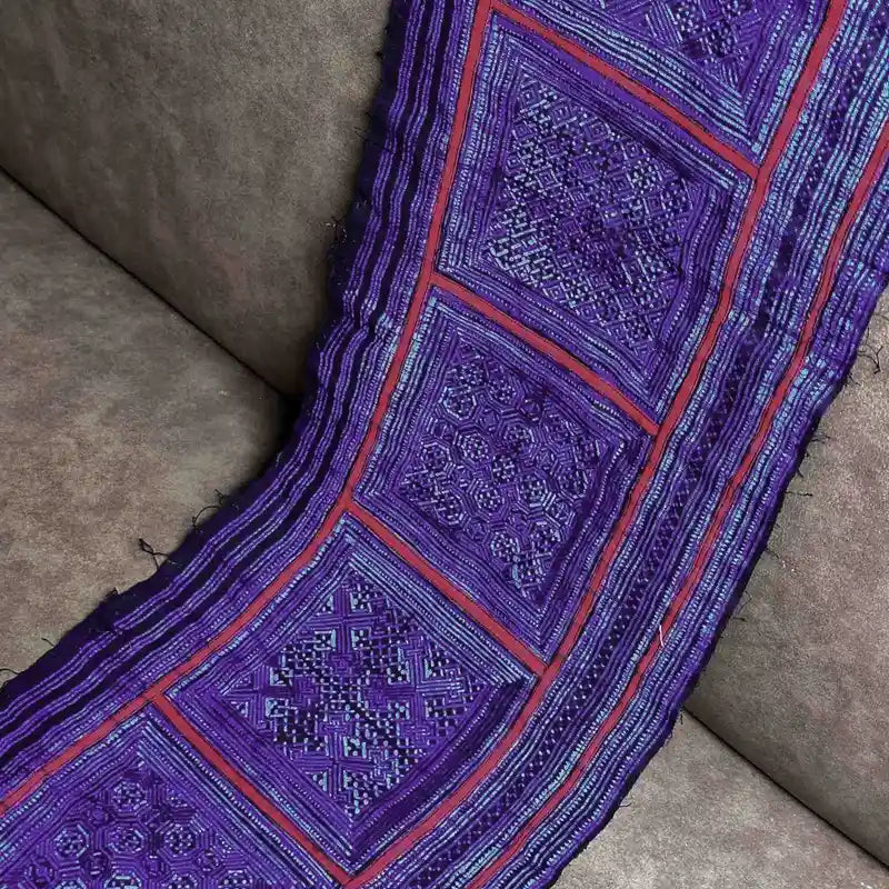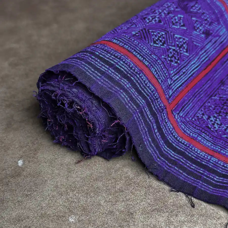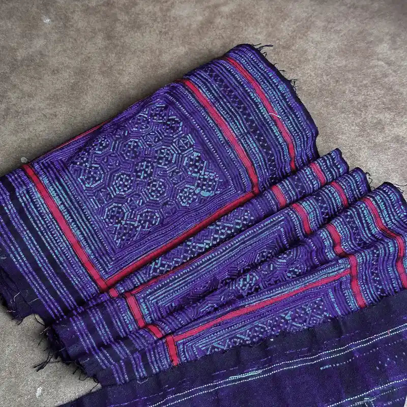 This fabric was a part of an authentic skirt of H'mong women in Mu Cang Chai, Vietnam. It is crafted on cotton by skilled H'mong women. Unlike mass-produced fabrics, this fabric has been lovingly used over time, lending it a uniquely soft texture that only adds to its charm.