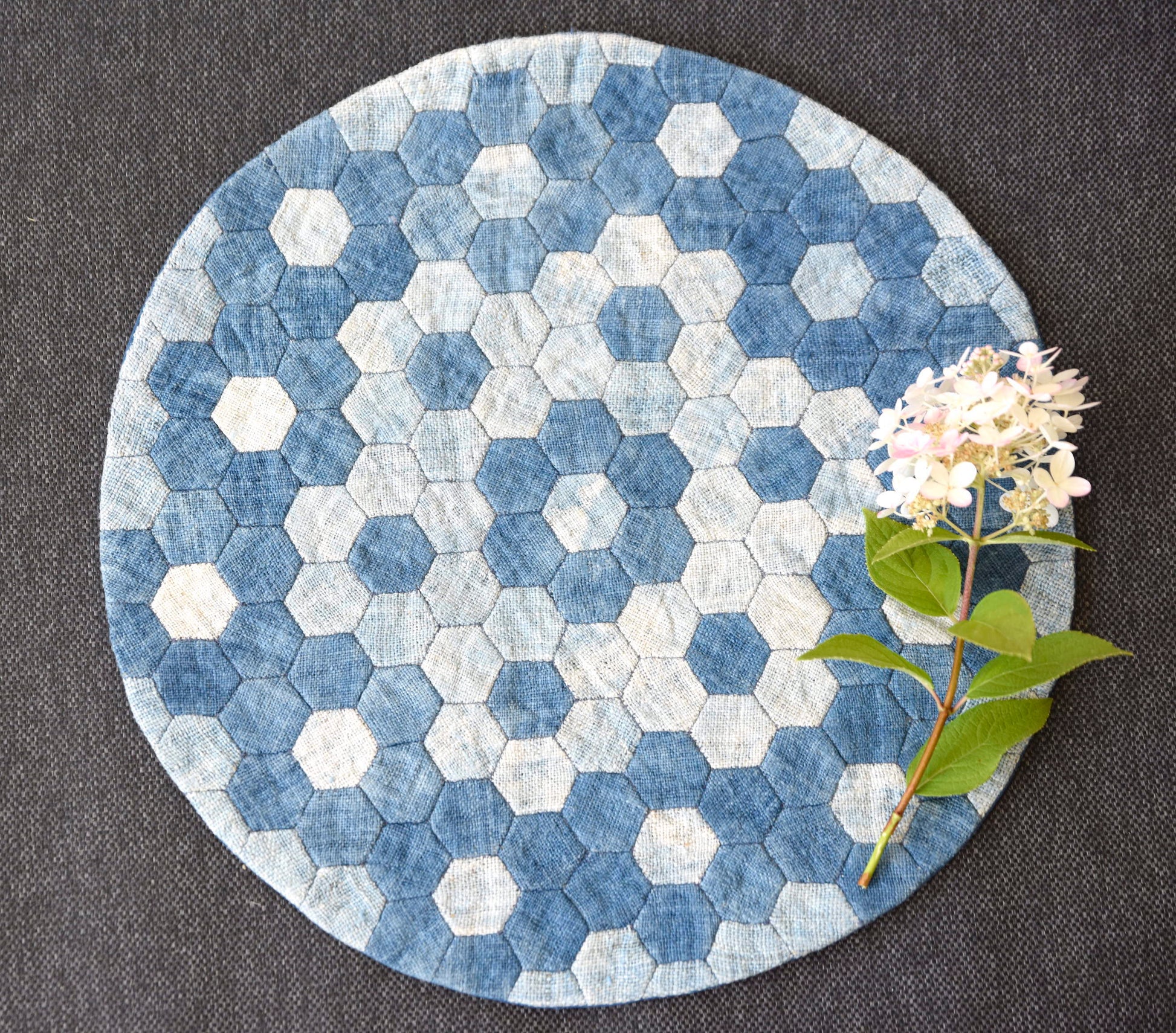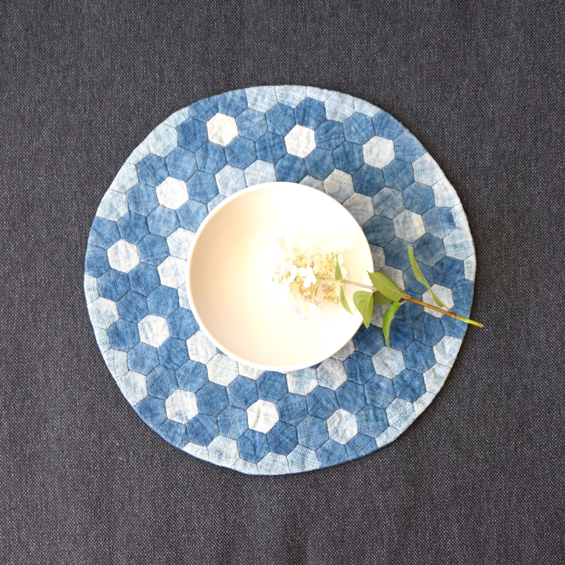 Unique quilted round placemat, hand-stitched, handwoven hemp fabrics, indigo dye
